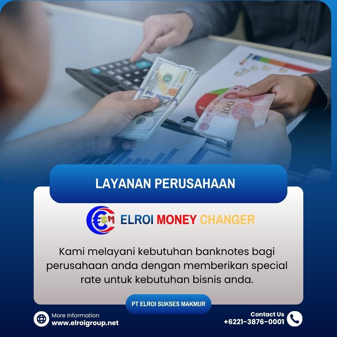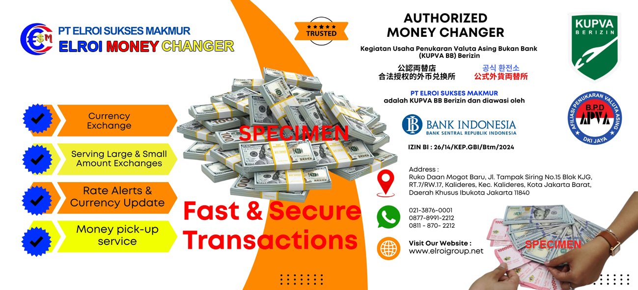 Dengan pengalaman dan izin usaha yang sah, kami menjamin transaksi yang aman dan terpercaya untuk semua kebutuhan jual-beli mata uang asing Anda di elroi money changer.